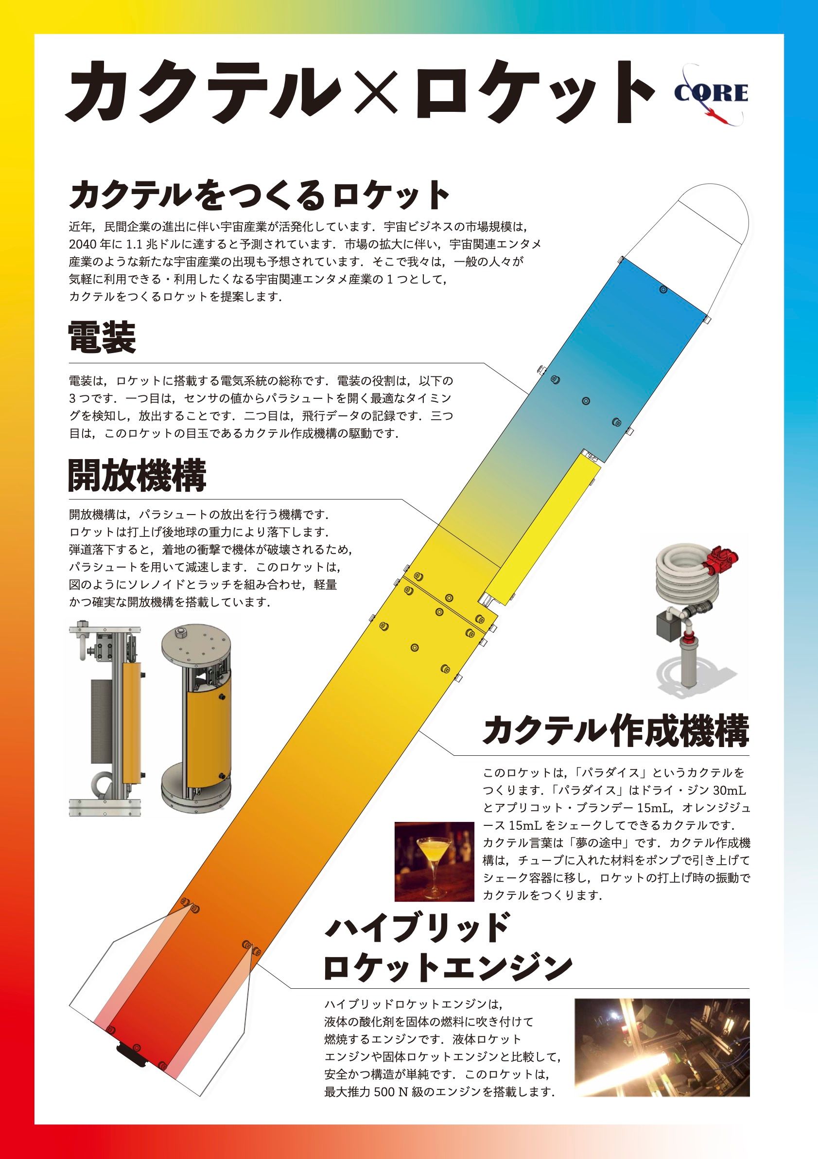 我々、CORE’s Barの主要ミッションは「飛翔中にカクテルを作ること」です!ロケットは飛翔中に振動しますが、この振動はロケット内部の電子基板や搭載物を破壊する可能性がある為、一般的には悪者扱いされます。 その振動を逆手にとってカクテルを作っちゃおう!という発想です笑